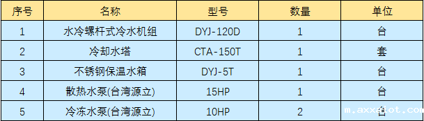 清远皮革厂压花机橡胶辊冷却,通过工厂技术人员核算,需要配120HP水冷螺杆式冰水机组2台,客户直接百度水冷螺杆式冰水机找到世界杯比赛直播平台官网,通过几天的电话及文字沟通确认,最终订购2台120HP水冷螺杆式冷水机组以及辅助设备,型号及数量如下表: